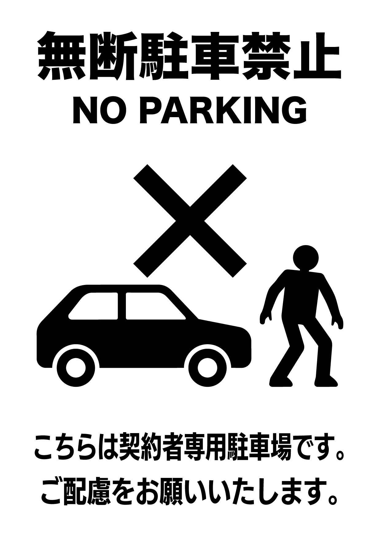 マンションやアパートの大家さん、店舗の駐車場管理の方におすすめです。カラーインクを使わない白黒のデザインは、雨に濡れても滲みにくいレーザープリンターでの印刷や、ラミネート加工をして屋外のフェンスやカラーコーンに掲示するのに適しています。無断駐車によるトラブルを未然に防ぐための警告表示として、または契約者様への配慮を示す看板としてご活用ください。商用OKですので、不動産管理会社の資料用素材としてもお使いいただけます。